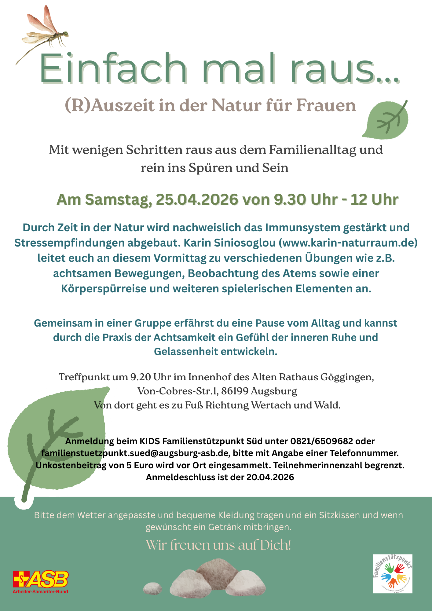 Durch Zeit in der Natur wird nachweislich das Immunsystem gestärkt und Stressempfindungen abgebaut. Karin Siniosoglou (www.karin-naturraum.de) leitet euch an diesem Vormittag zu verschiedenen Übungen wie z.B. achtsamen Bewegungen, Beobachtung des Atems sowie einer Körperspürreise und weiteren spielerischen Elementen an.